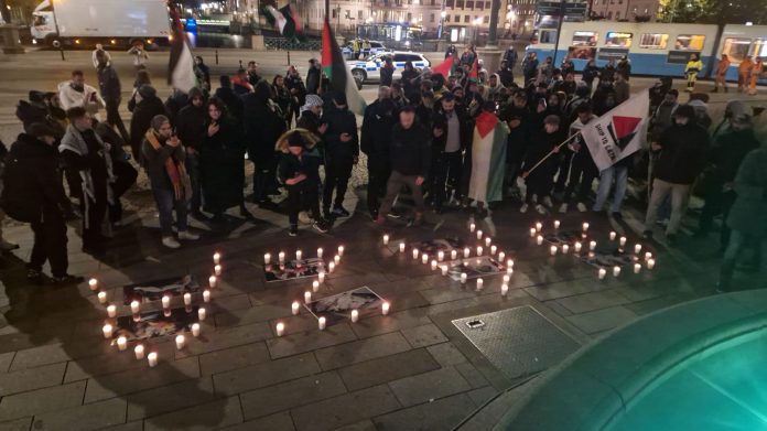 Göteborg, 18 oktober – I skenet av nattens stjärnor, samlades göteborgare med palestinsk bakgrund vid Brunnsparken. Tillsammans tände de ljus för att hedra de över 500 oskyldiga liv som gått förlorade efter bombningen av al-Ahli sjukhuset i Gaza.