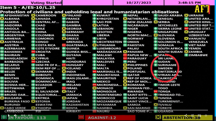 I en sen nattomröstning röstade FN:s generalförsamling om en omedelbar vapenvila i Gaza. Denna resolution nämnde inte specifikt Hamas eller Israel, och trots att 120 länder röstade för det, avstod Sverige från att ta ställning. Israels FN-ambassadör Gilad Erdan kallade det “en svart dag för FN och mänskligheten”.